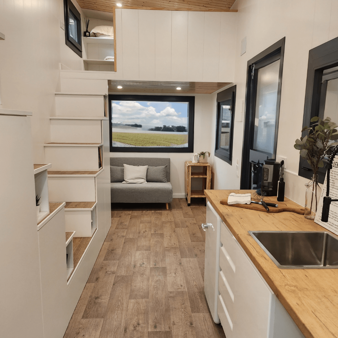 Su estructura, incluido el remolque, tiene 4 metros de altura. Es el modelo más demandado. Gracias a su doble altillo y una habitación en planta baja, es el modelo que puede alojar más personas, hasta 6. Al disponer de un dormitorio en planta baja permite ser un diseño más accesible.
